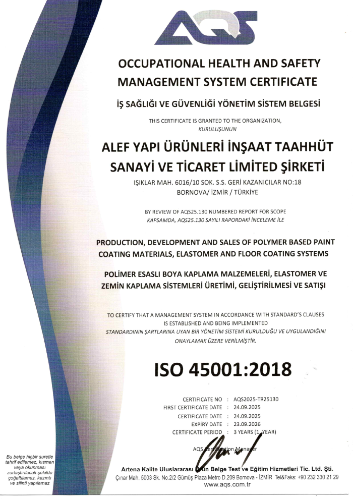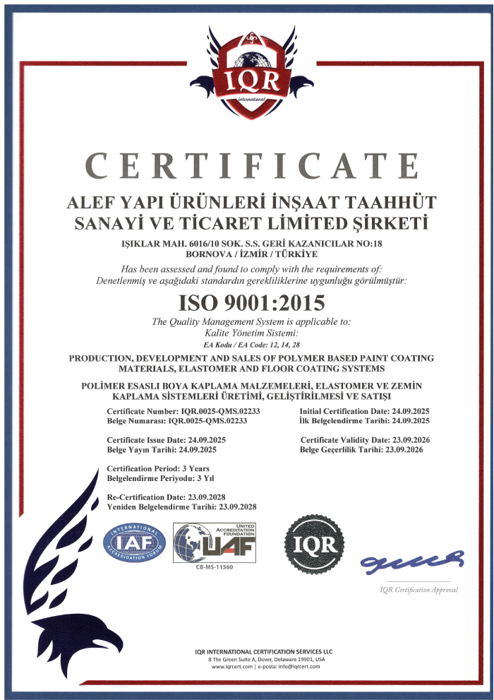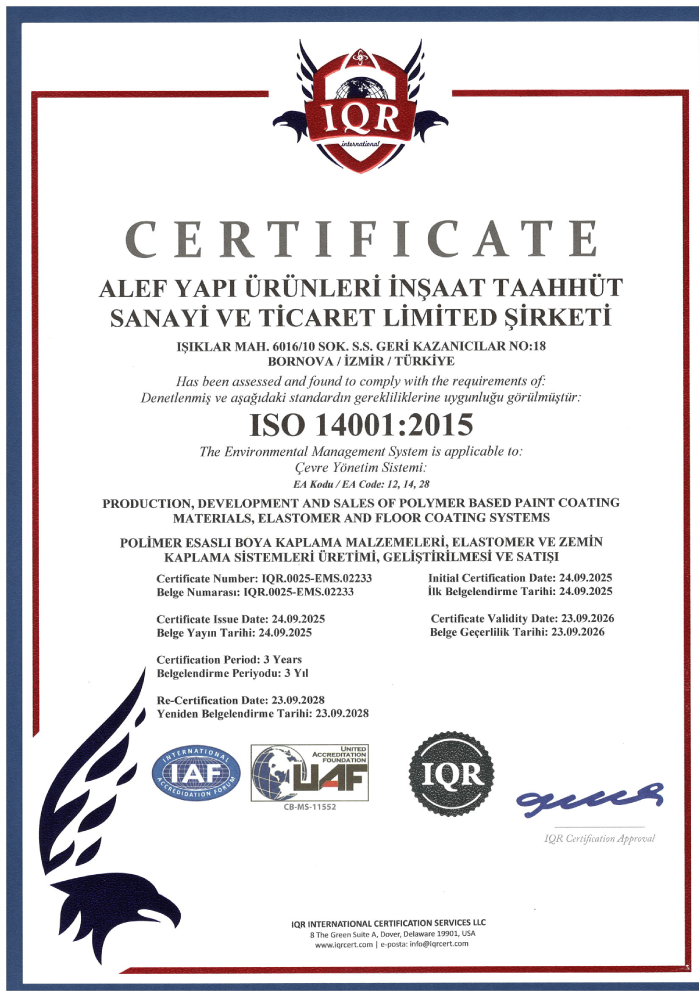 At Alef Yapı, we uphold the highest standards in environmental management, quality management, and occupational health and safety. Our commitment to customer satisfaction and stakeholder value is reinforced by internationally recognized certifications, including ISO 14001:2015 Environmental Management System, ISO 9001:2015 Quality Management System, and ISO 45001:2018 Occupational Health and Safety Management System. These certifications reflect our dedication to sustainability, excellence, and compliance with global standards.